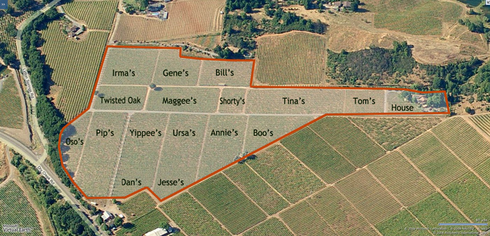 Blocks 1-6, named for dog friends: BOO, ANNIE, URSA, YIPPEE, PIP & OSO, respectively - 5 german shepherds and the Pip. A homogeneous 10 acres of zinfandel planted in 1963 and headed higher than usual. The eastern edge has 2 huge olive trees known to be 100+ years of age.