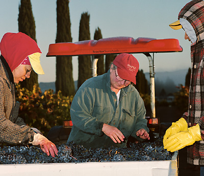 Dawn frost covers the clusters right before an early morning harvest. We head-train vines and limit fruiting positions (spurs) to no more than 10 for the strongest vines.